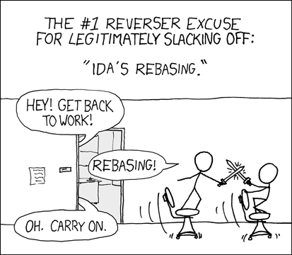 <figure><img src="https://3899235193-files.gitbook.io/~/files/v0/b/gitbook-x-prod.appspot.com/o/spaces%2Fd4yKxBBBv1qcoSuL2US4%2Fuploads%2Fgit-blob-2249cd6fe8d18c73d00857ac8e42df2a59ffc5e8%2Frebasing.png?alt=media" alt=""><figcaption><p>Based on <a href="https://xkcd.com/303/">Compiling</a> by <a href="https://xkcd.com/">xkcd</a>, licensed under CC BY-NC 2.5, modified by <a href="https://www.hex-rays.com/">Hex-Rays</a>.</p></figcaption></figure>